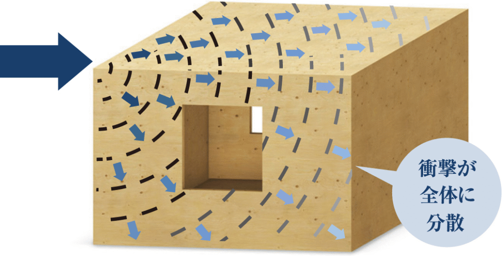 これに対して、スウェーデンハウスは強度に優れた木質パネルを強固に接合し、建物全体を一体化させた「モノボックス®構造」を採用。地震の揺れを「面」で受け止めて分散することで、高い剛性と耐震性を実現しています。