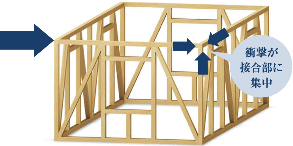従来の木造住宅は、柱・梁・筋交い・接合金物で構成される「軸組構造」です。この構造では、地震の衝撃が接合部に集中しやすいという弱点があります。