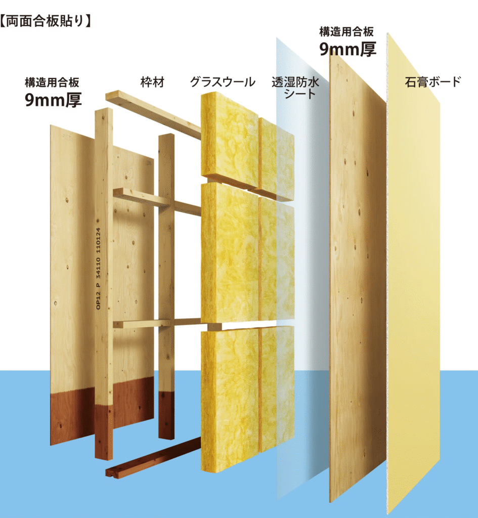 外壁パネルの枠材の両面に構造用合板を貼り、さらに室内側には石膏ボードを重ねて一体化。これにより、一般的な2×4住宅に比べて「強さ」と「堅さ」で圧倒的な差を生み出しています。