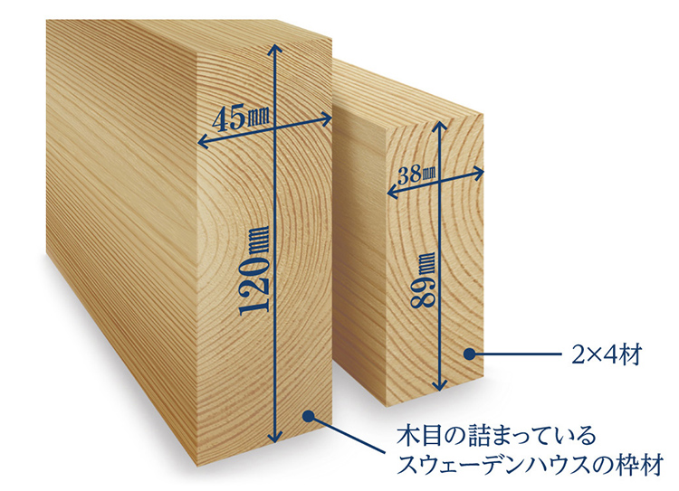 スウェーデンハウスの木材は、寒冷地でゆっくりと育った樹齢80年以上の年輪のつまった針葉樹を使用しています。