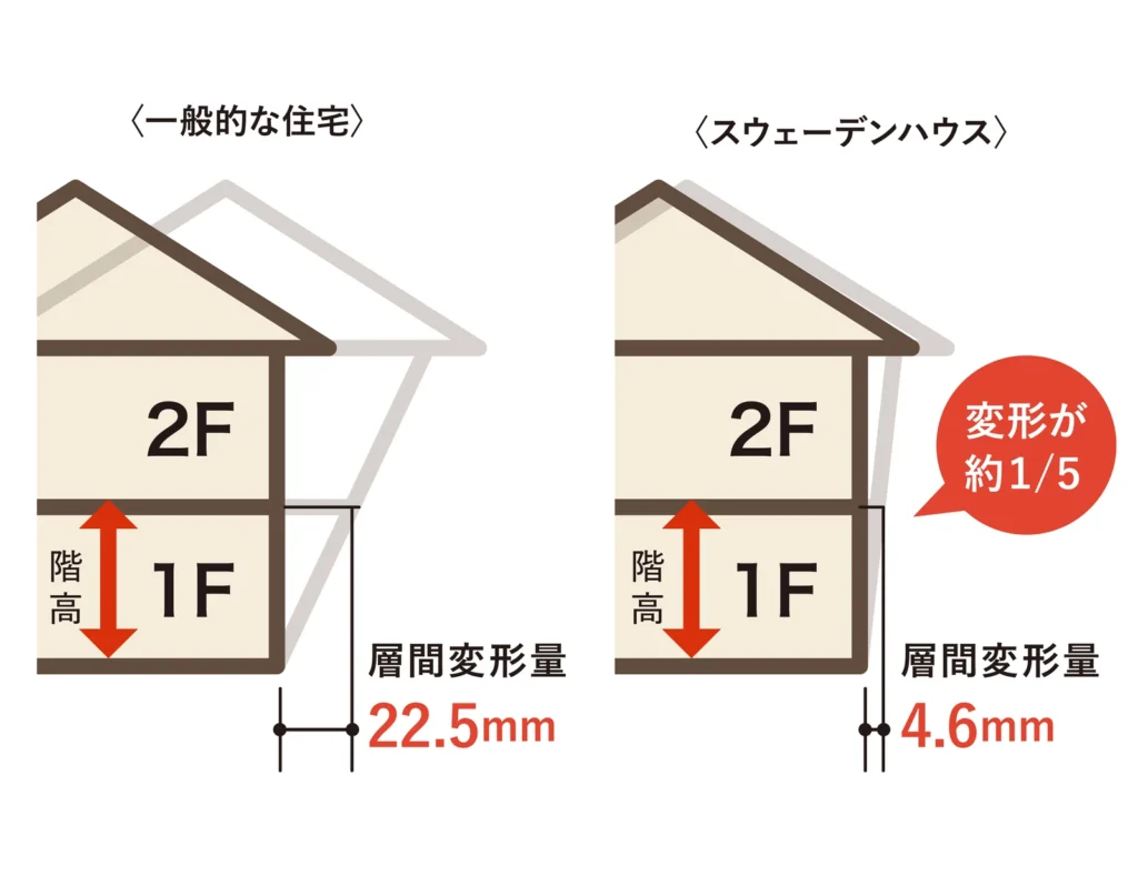 「層間変形角」(そうかんへんけいかく:建物の変形量を示す指標)でも、その強さは実証されています。スウェーデンハウスの実験値は1/587。一般的な住宅(1/120)に比べて変形量は約1/5と極めて小さく、地震後も「そのまま住み続けられる家」であることが証明されました。