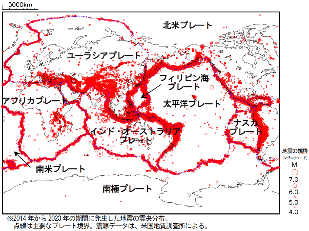 それに対して日本列島は、太平洋プレート、フィリピン海プレート、北米プレート、ユーラシアプレートという4つの巨大プレートが交差する、世界屈指の地震多発地帯です。